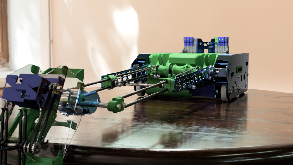 Arms can be a useful tool for extension. Long arms need large reduction ratios to drive. The example in the Single Arm section uses a 254.5:1 reduction. It is recommended to transfer torque to the arm through a gear, chain, or belt rather than directly mounting to a motor shaft due to axial forces and the ability to get a larger reduction. Due to the large amount of momentum these arms can carry, if suddenly stopped they may be able to break a motor’s gearbox or even tip your robot over. Software control can help to reduce the load on motor gearboxes (see Control Loops).