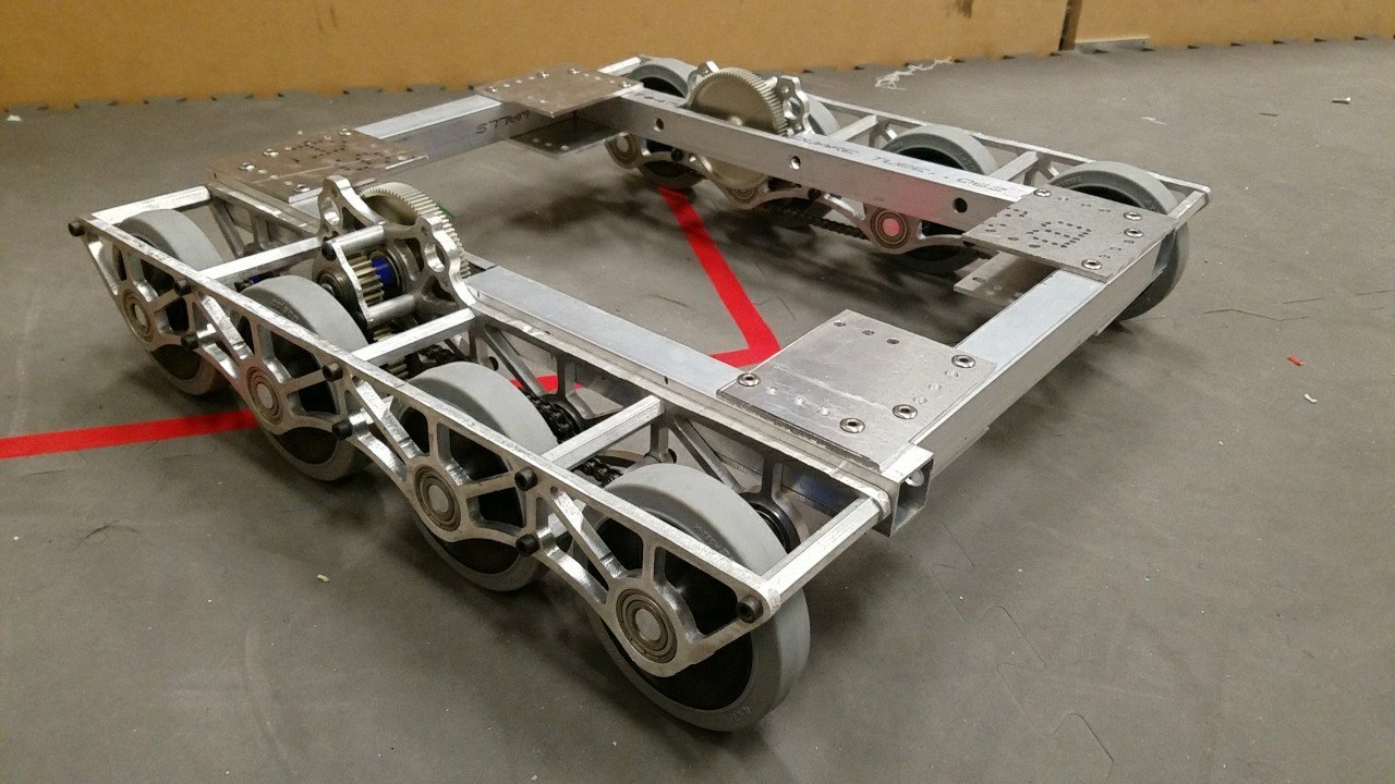 A drop center 6WD is a 6 wheel drive with the center wheel mounted slightly below the other two wheels. The drop should be anywhere from more than 1/16» up to 1/4». However, the recommended drop is around 1/8». Typically, lighter robots (<25 lbs.) can have less drop, while heavier robots (>25 lbs.) perform slightly better with more than 1/8» drop.