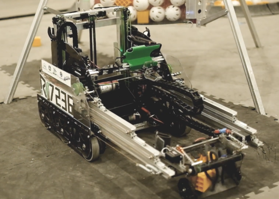 On 7236’s robot, the slides are not facing each other. The sag caused by this is largely mitigated by supporting the extension at the end with omni wheels.