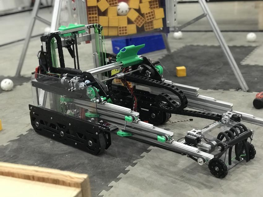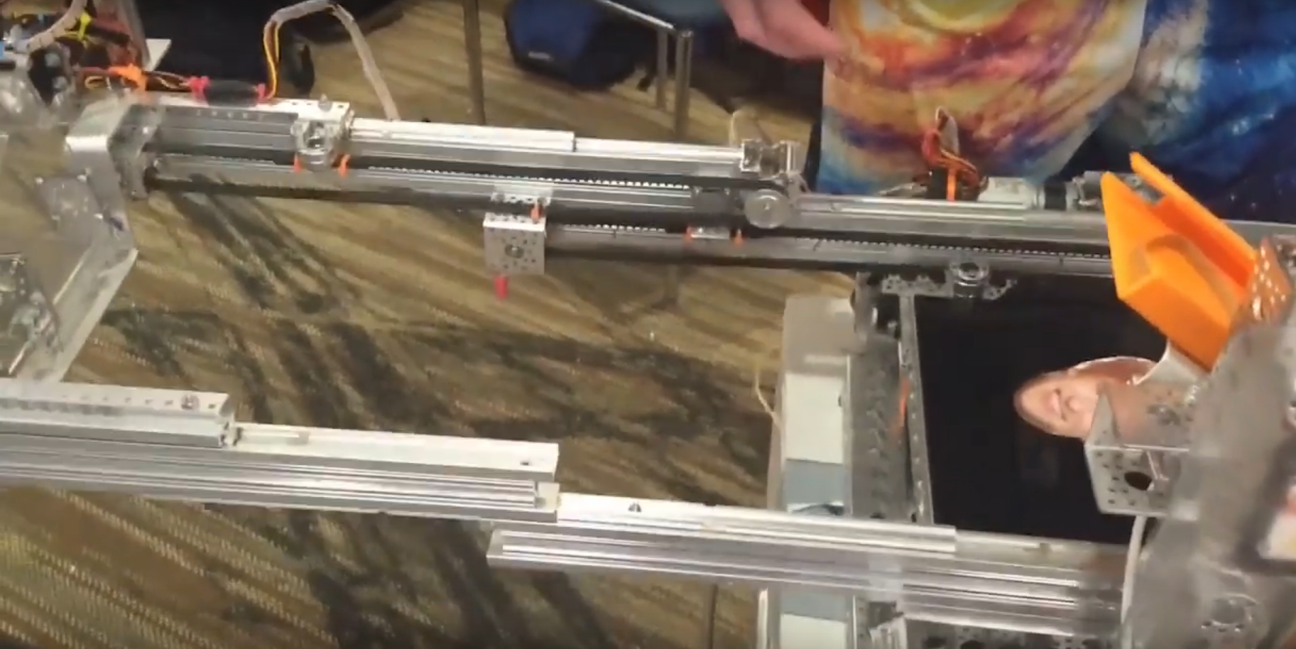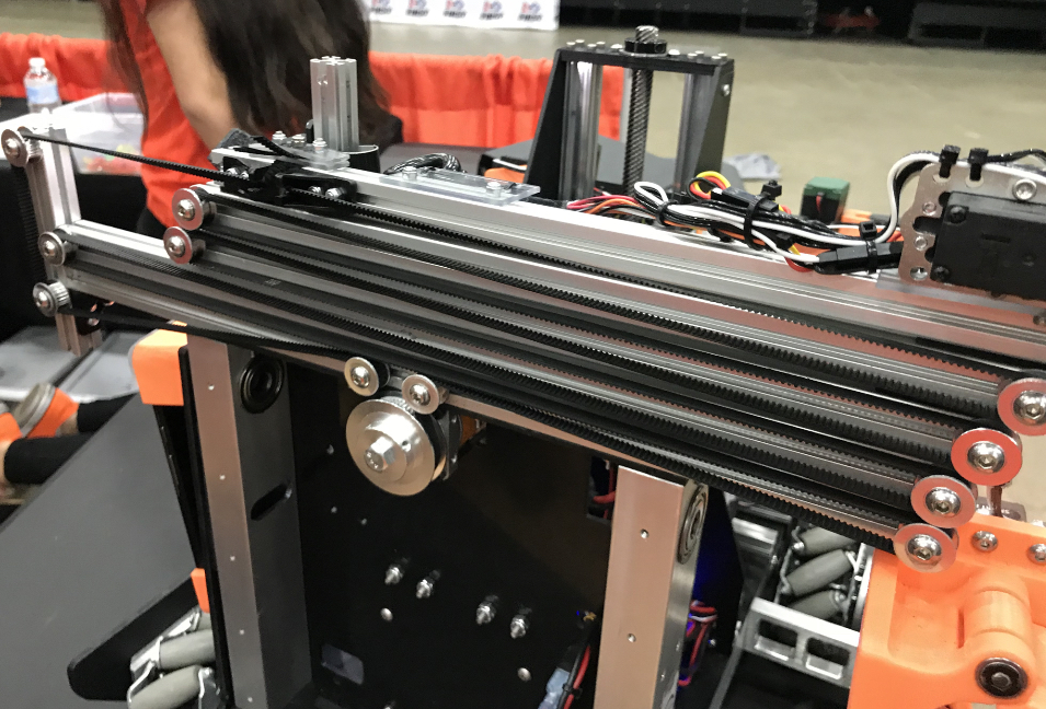 Almost ubiquitous in FRC®, belt and chain elevators have existed seemingly forever. The basic premise is to have sprockets or pulleys mounted at the top and bottom of the elevator to the robot superstructure. Then, the belt or chain is hard bolted to the elevator near the bottom sprocket or pulley. When the chain or belt is driven, the elevator will move up and down. It is possible for elevators to have multi stage designs, but powering them will be more complex.