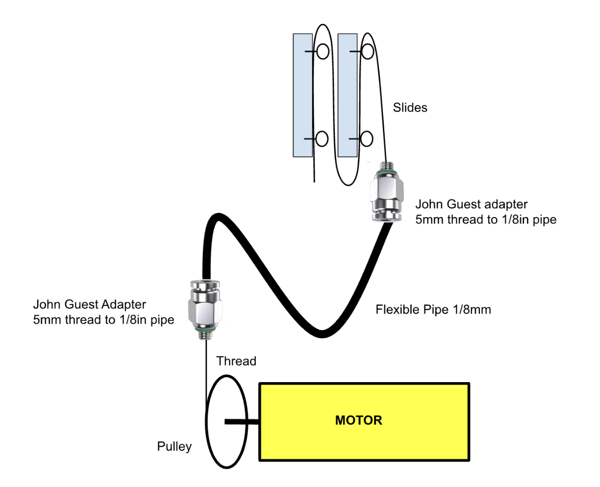 If you’re looking for the ability to mount your linear slides in a different location than your motor/pulley, consider using PTFE tubing and John Guest Adapters to route the string.