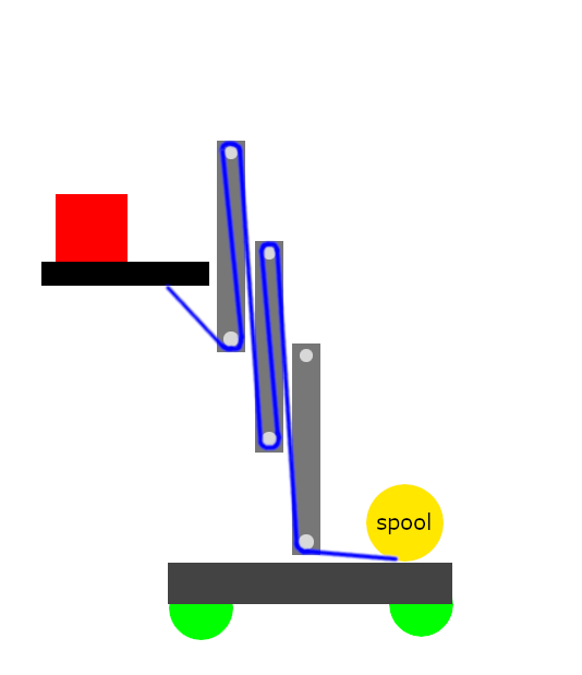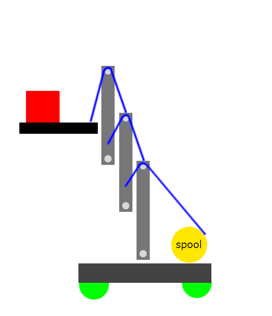 When the motor rotates one direction, the extension spool reels in the first string, decreasing the distance between the base and the bottom of the first stage. This pushes the second string forward, decreasing the distance between the top of the first stage and the bottom of the second stage, and so on. Note that unlike continuous rigging, every stage moves at the same time. The second stage moves 2 times as fast as the first stage relative to the base, the third 3 times as fast, and so on.