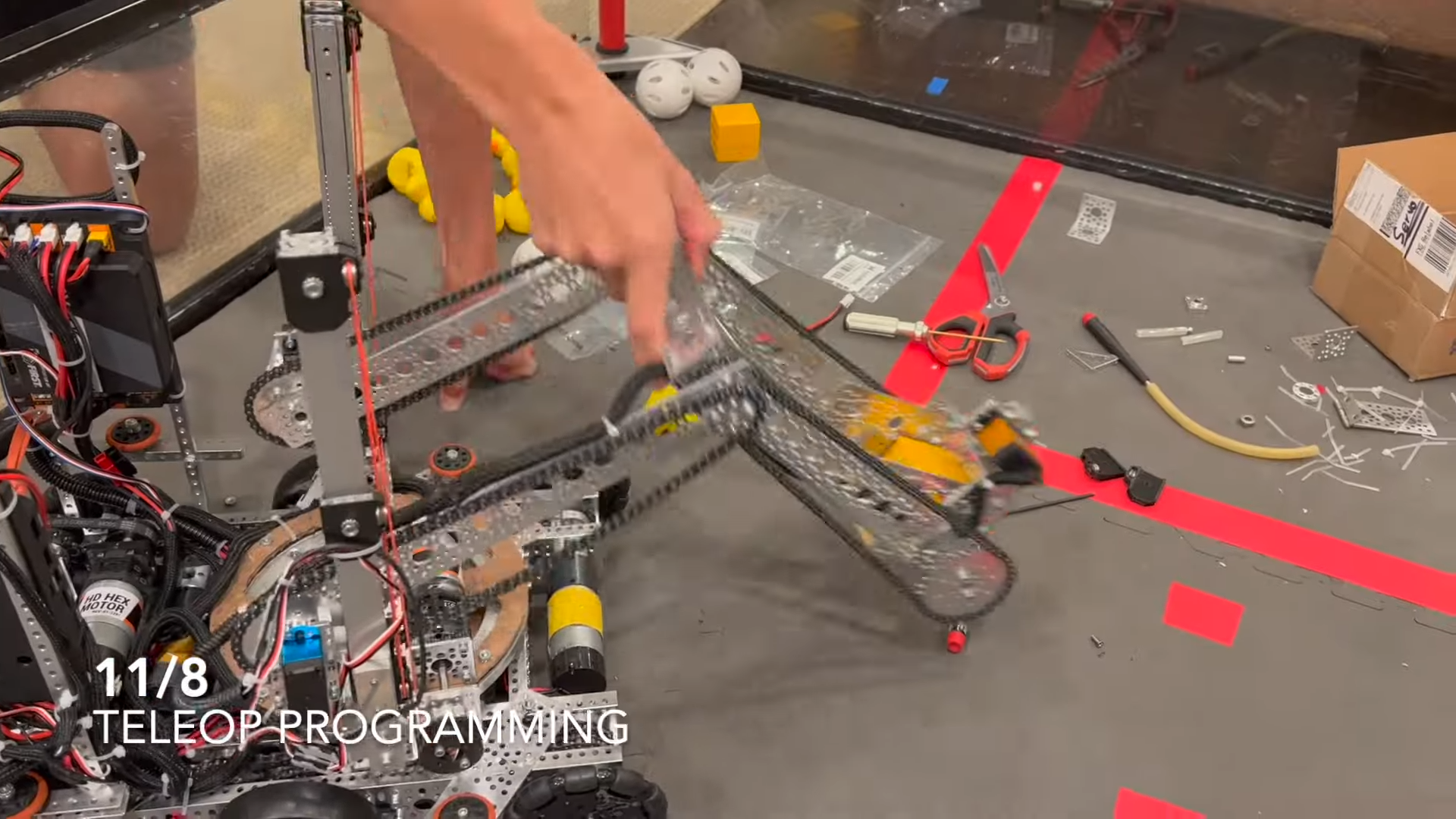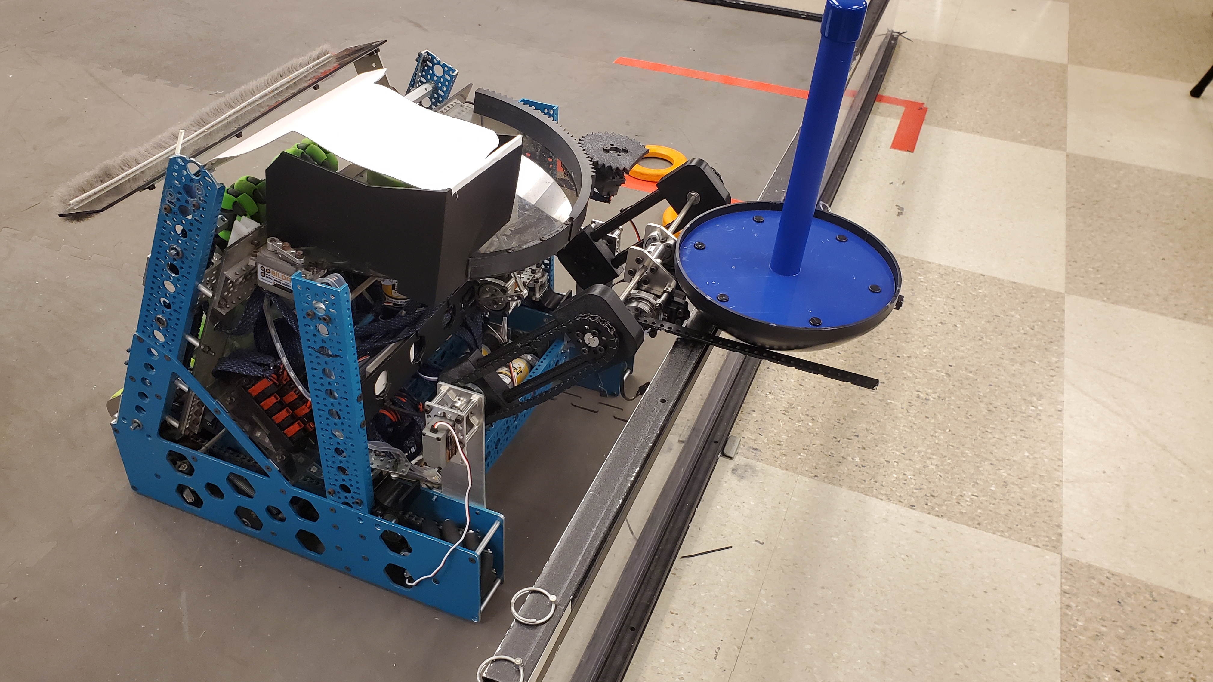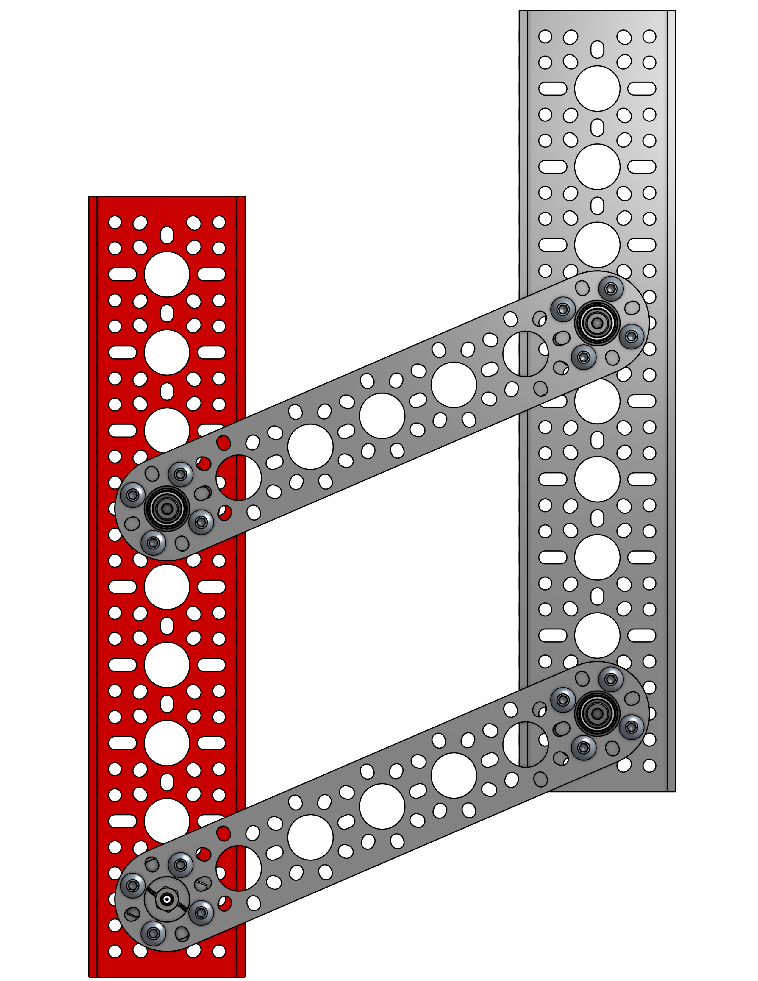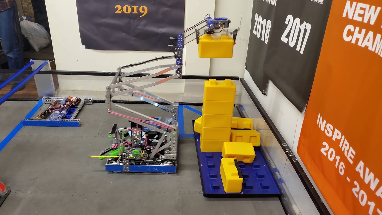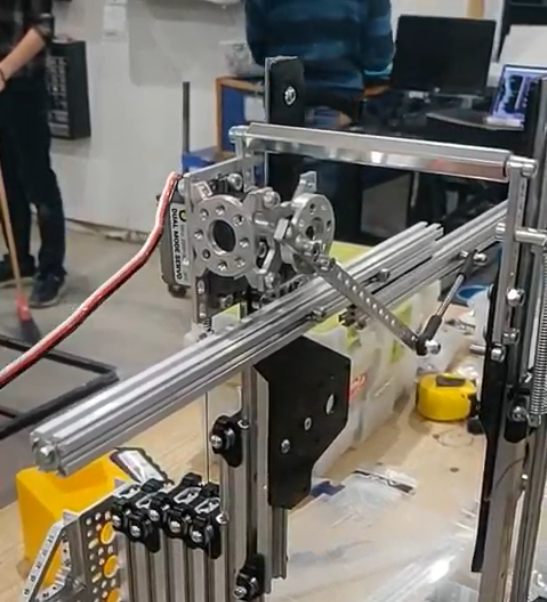 One type of linkage is called a four bar linkage. This is a linkage that keeps the end bar at the same angle to the ground at all times. For example, if the end bar of a virtual four bar is parallel to the ground when retracted, it will be parallel to the ground at all times, even when rotated fully out. This is beneficial for mechanisms like claws, which you want parallel to the ground during operation. In addition, four bars can provide extension outside of the robot frame, and generally provide both vertical and horizontal extension due to the «arc» that the arm follows. Also, the construction material of the four bar can be carefully selected to save weight.