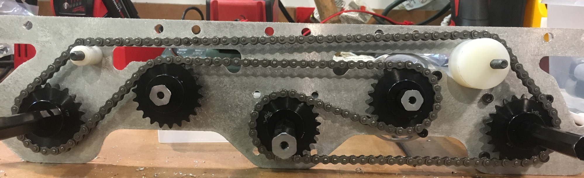 Chain wrap, especially in one chain run, can be problematic. Typically, teams use either one or two chain runs (pieces of chain) per drivetrain side. However, one chain run can require more than one idler sprocket and get very complex in order to maintain proper chain wrap.