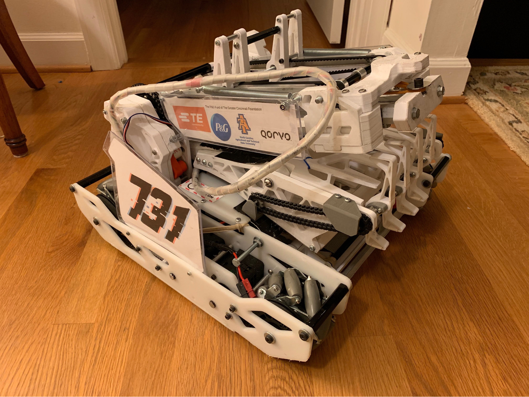 Utilizes a 3D printed (PETG and TPU) and machined (milled) arm/intake with a custom HDPE drive train (CNC routed)