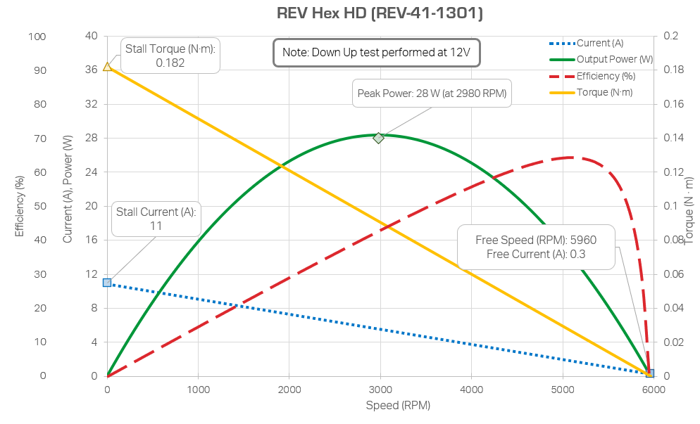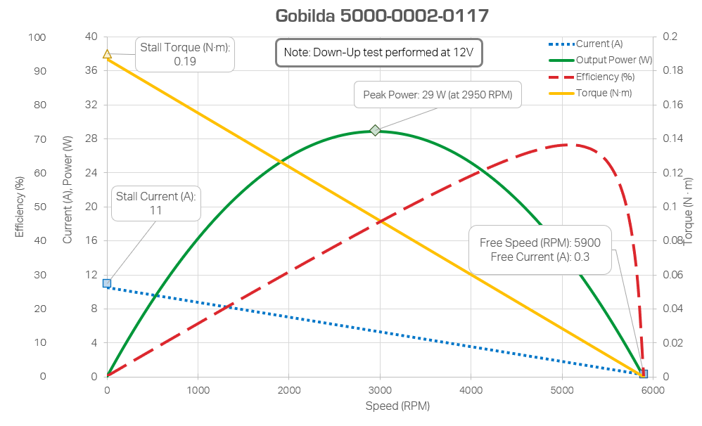 In order to figure out how much power your motor will be consuming or outputting, its helpful to reference a motor curve. These are data sheets that plot the motor’s output speed, output torque, output power, and efficiency all on one graph. Every FTC legal motor except the Core Hex has been dyno tested, and their data are below. It is safe to assume other non-current limited motors (such as servos) follow similarly-shaped curves, although with different speed, torque, and power outputs.