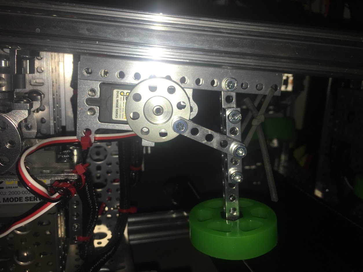 Linkage example, courtesy of team 4137 Islandbots. A goBILDA flat beam is used as the link.¶