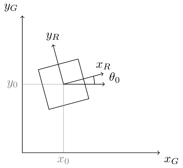We can refer to the current pose (\(\vec{x}_0\)) of the robot as \(\begin{pmatrix} x_0 \\ y_0 \\ \theta_0 \end{pmatrix}\). This is just fancy notation for a point on the field \((x_0, y_0)\) with a specified orientation of the robot–the heading \(\theta_0\). A pose generally has some beginning origin in the coordinate frame.