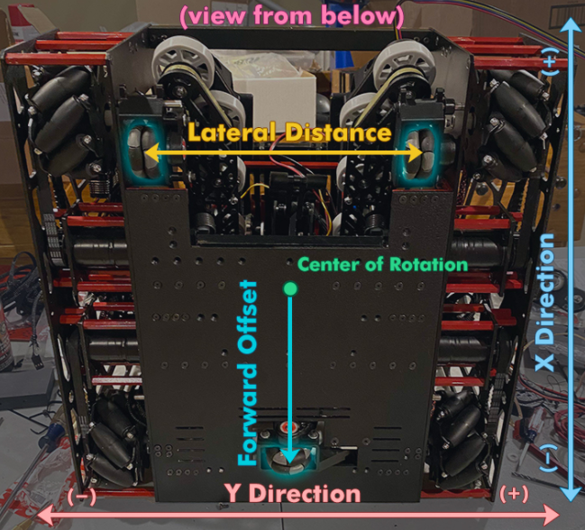 The displacement (or change in position) of the left sensor is \(\Delta x_l\) and the displacement of the right sensor is \(\Delta x_r\). The lateral distance between these two sensors is called the trackwidth, notated as \(L\). This is very important for determining angle for turning approximations. This value will need to be tuned, which means tested repeatedly and then brought to some converging value that is close to the actual measurement.
