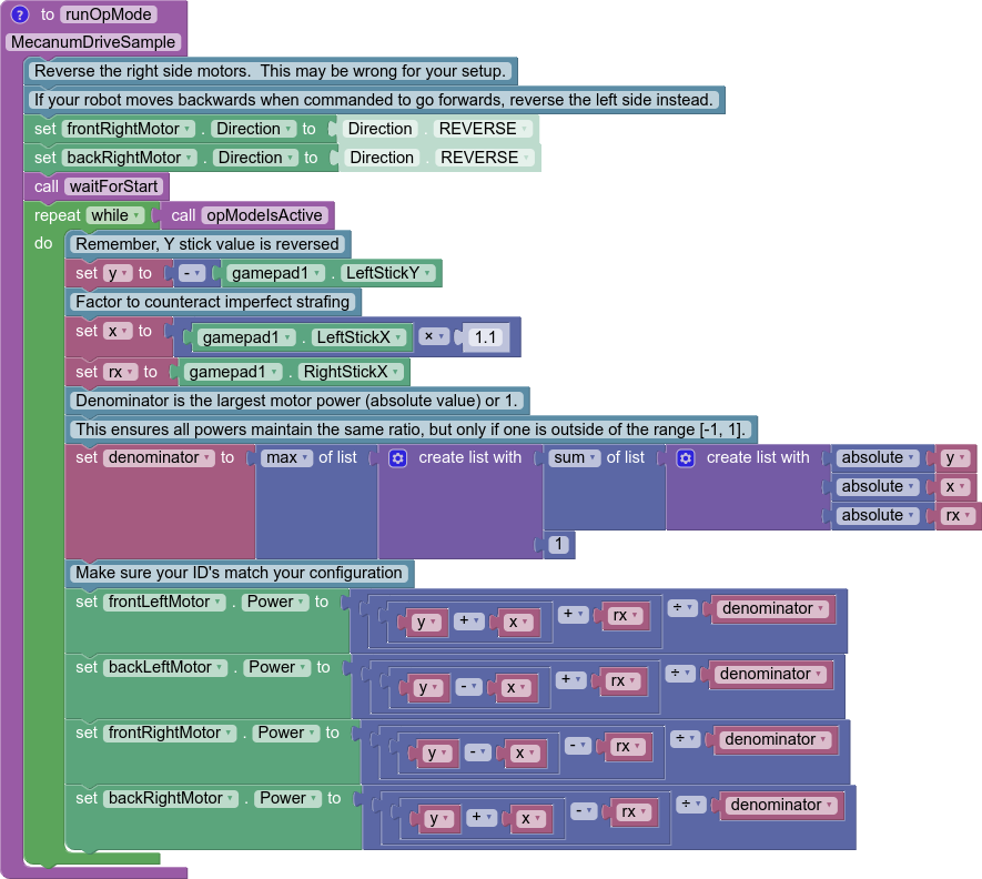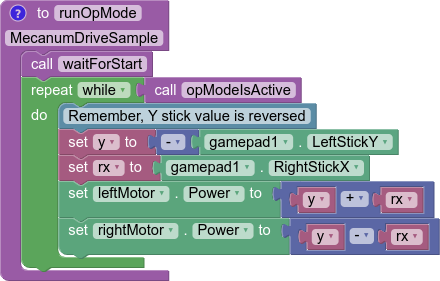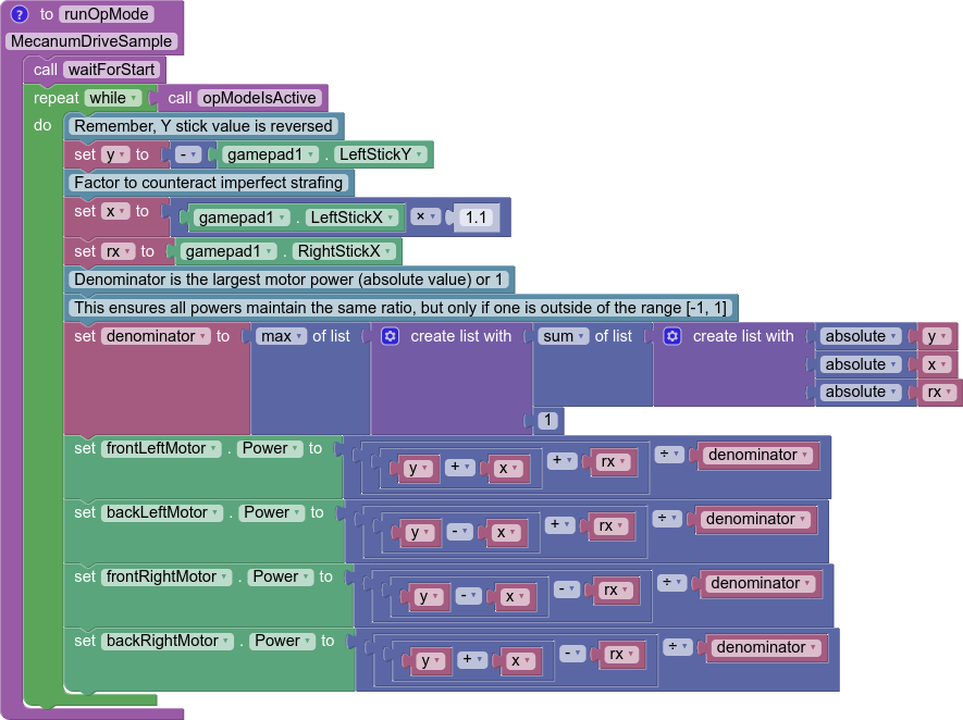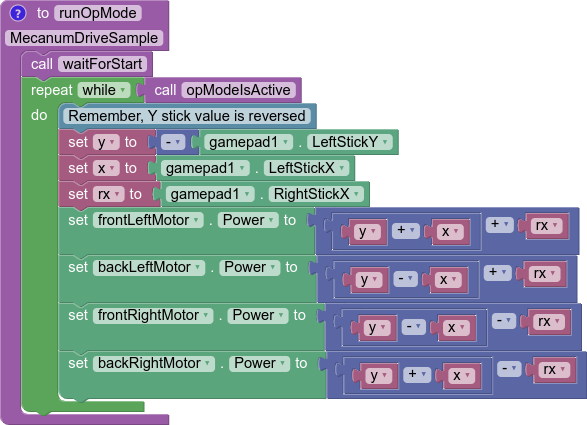 Applying omnidirectional movement with mecanum wheels operates under the same principle as adding turning into the tank example. The left stick X values will be added or subtracted to each wheel depending on how that wheel needs to rotate to get the desired movement. The only difference from turning is that rather than wheels on the same side being the same sign, wheels diagonal to each other will be the same sign.