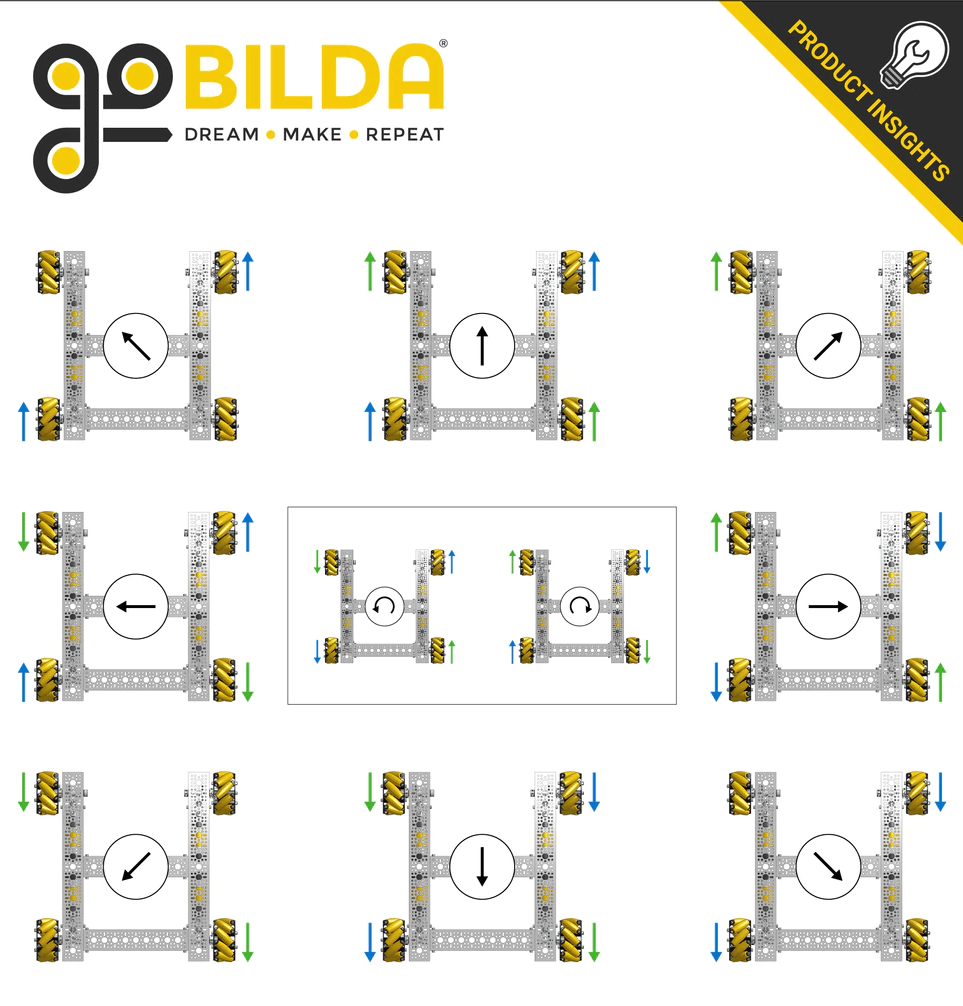 In the image above, vectors 1, 2, 3, and 4 are the force vectors created by the mecanum wheels when the chassis is instructed to drive towards the top of the image. All motors are driving forward. The blue and red lines are their X and Y components, respectively. Here are a few examples of how the wheels must be driven to achieve different movements: